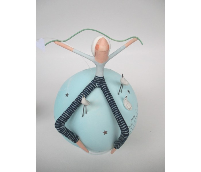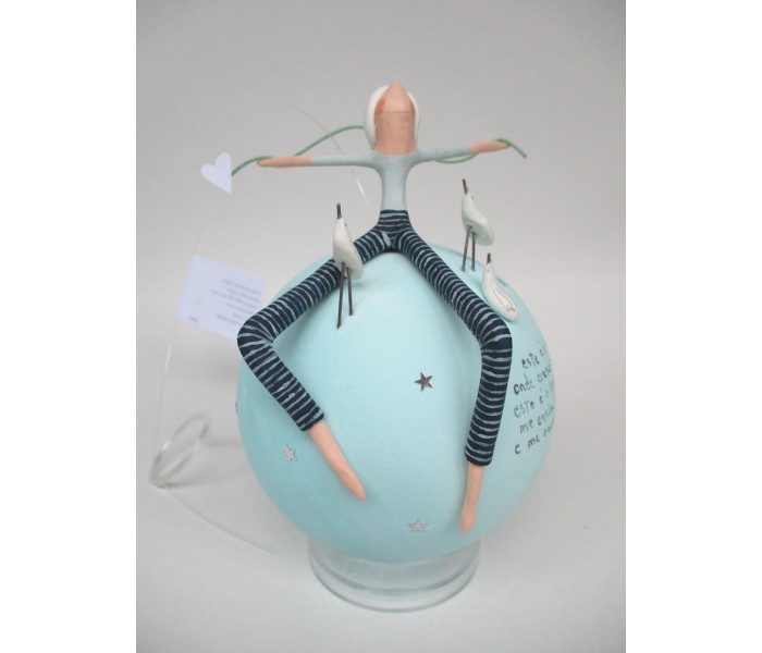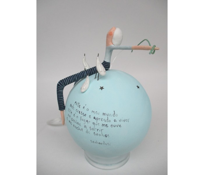 Escultura composta por mundo de 10 cm de diâmetro, figura com 13 cm e texto