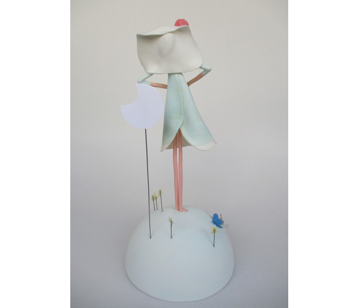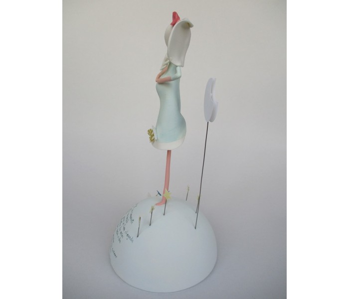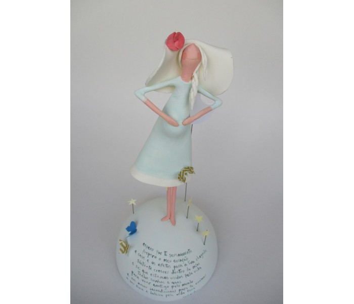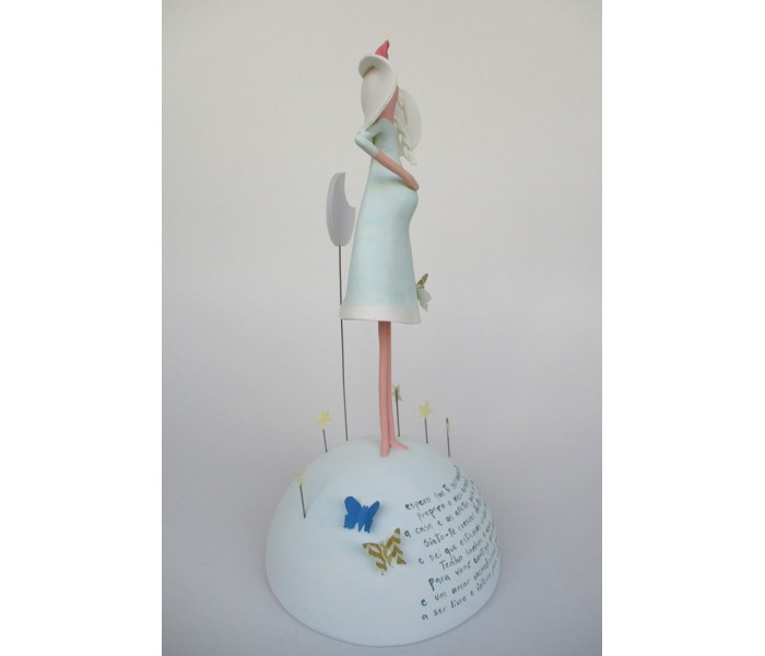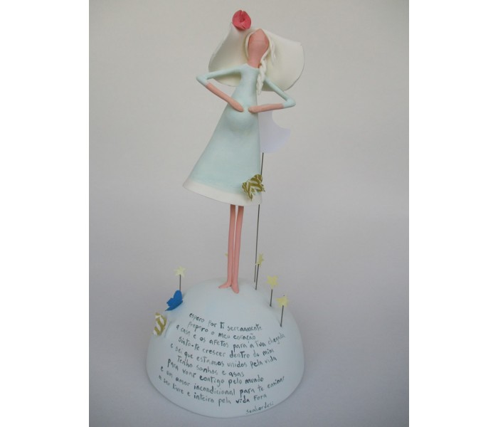 Escultura feita em massa ultra leve com base meio mundo de 12cm de diâmetro, figura de 18cm com texto