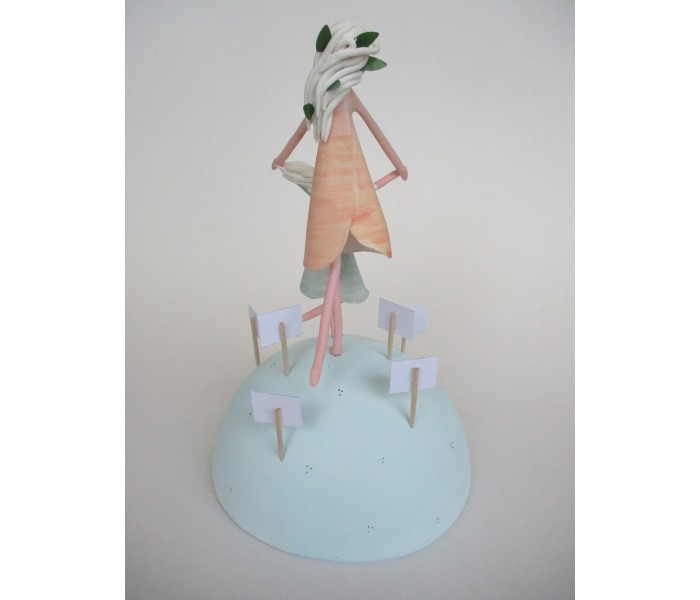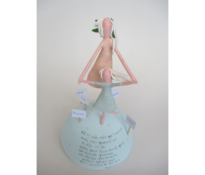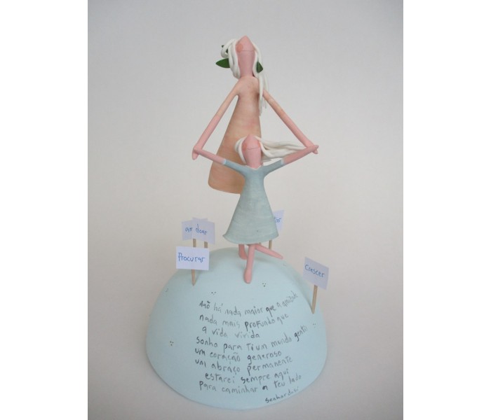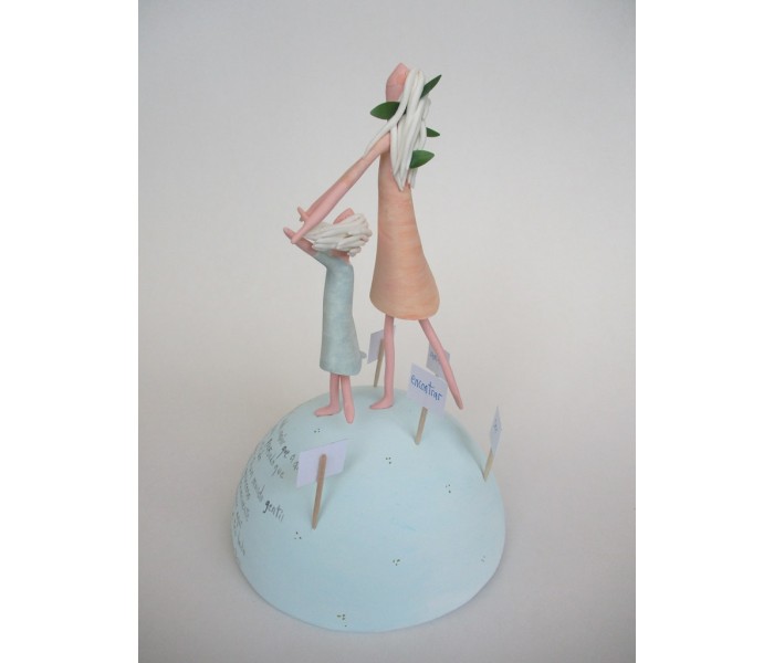 escultura composta por meio mundo de 12cm de diametro, figura maior de 13cm e outra mais pequena com texto