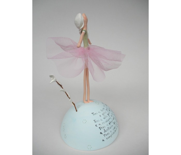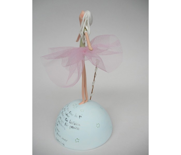 Escultura feita em massa ultra leve com base meio mundo de 10cm de diâmetro, figura de 13cm com texto