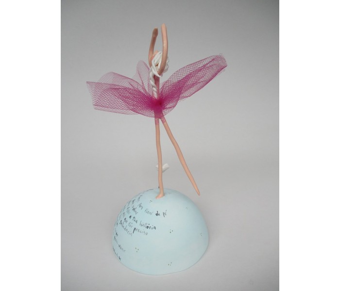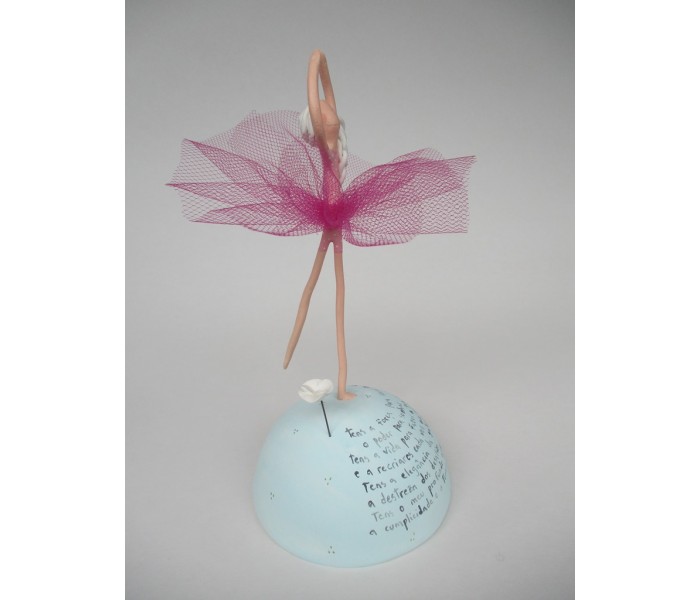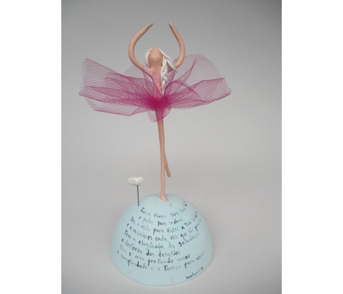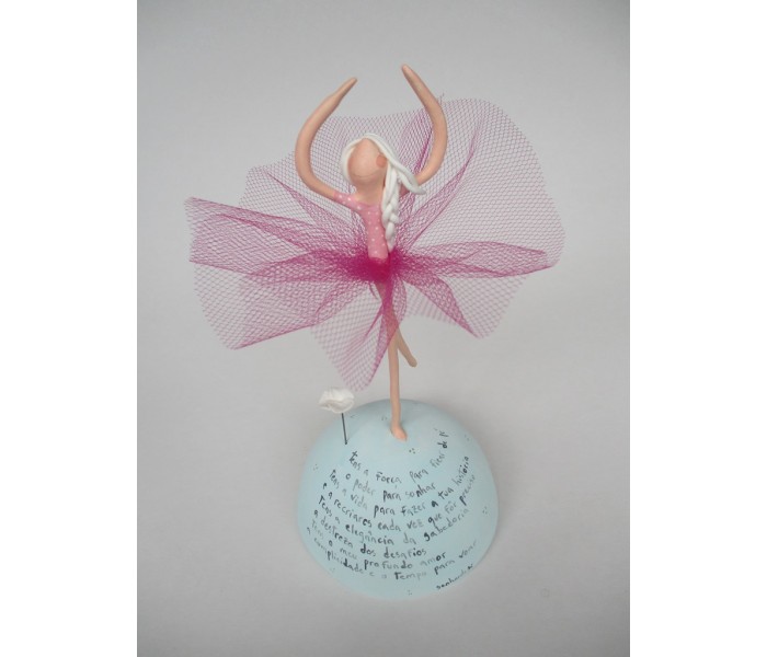 Escultura feita em massa ultra leve com base meio mundo de 10cm de diâmetro, figura de 13cm com texto