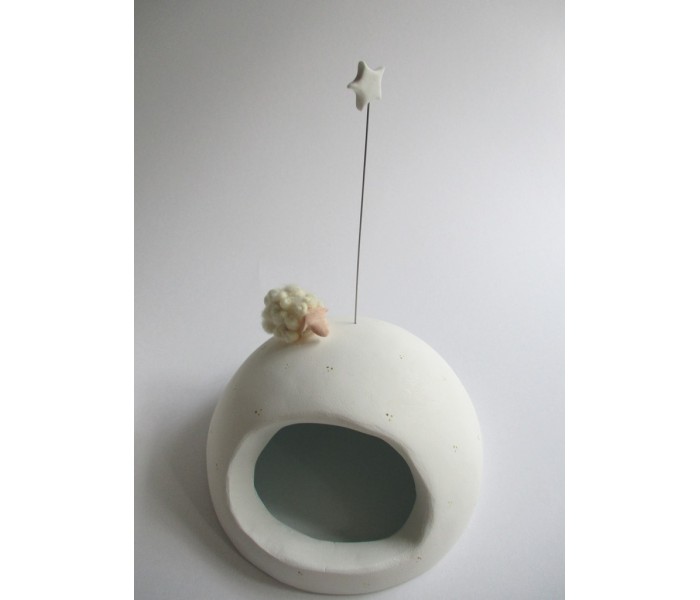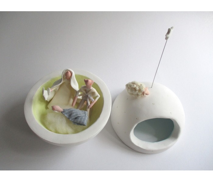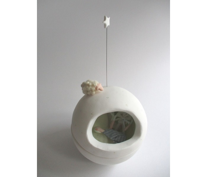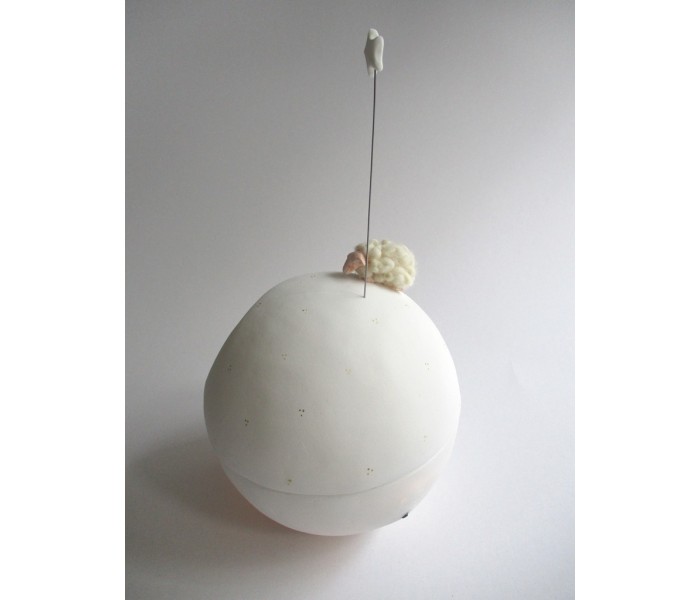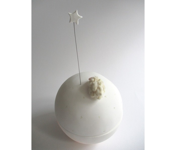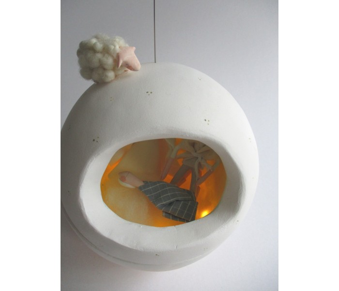 escultura feita em massa ultra leve com base um globo de 14cm de diametro, aberto ao meio, casal de 13cm e outra figura mais pequena com texto com luz led