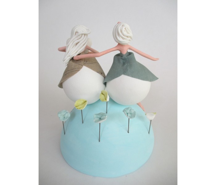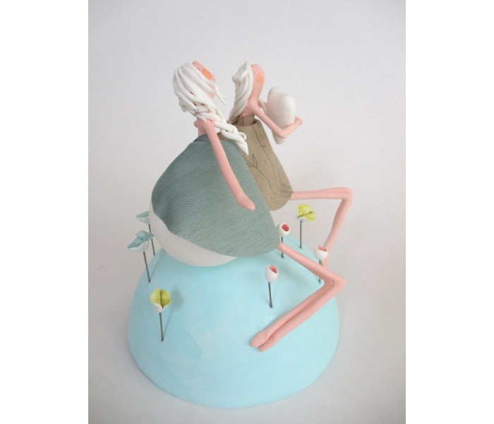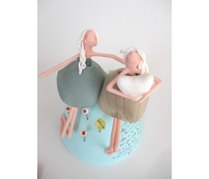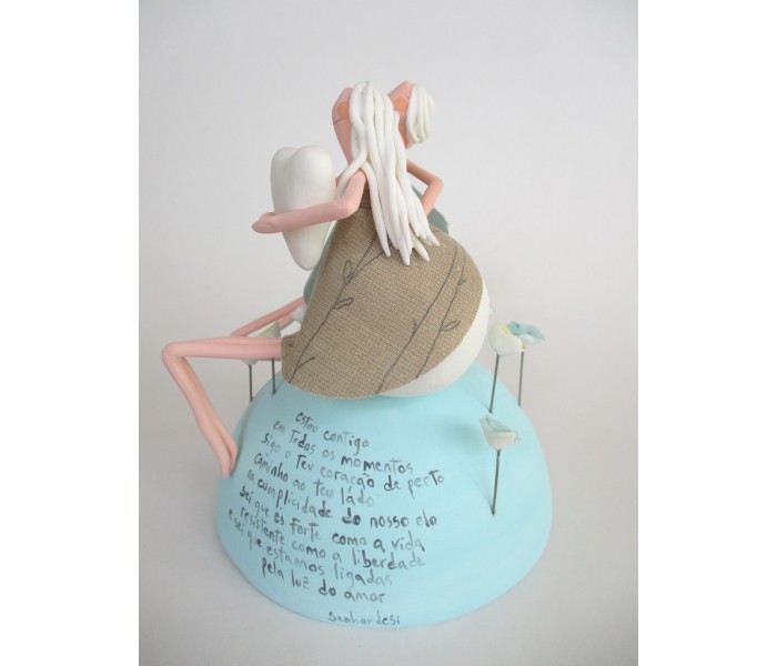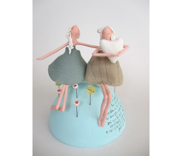 Escultura composta por meio mundo de 12cm de diametro, duas figuras de 15cm com texto