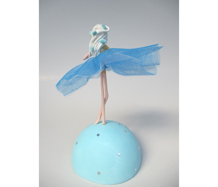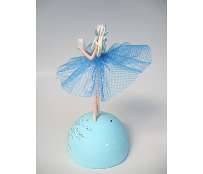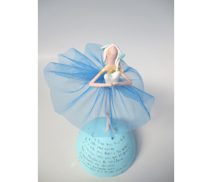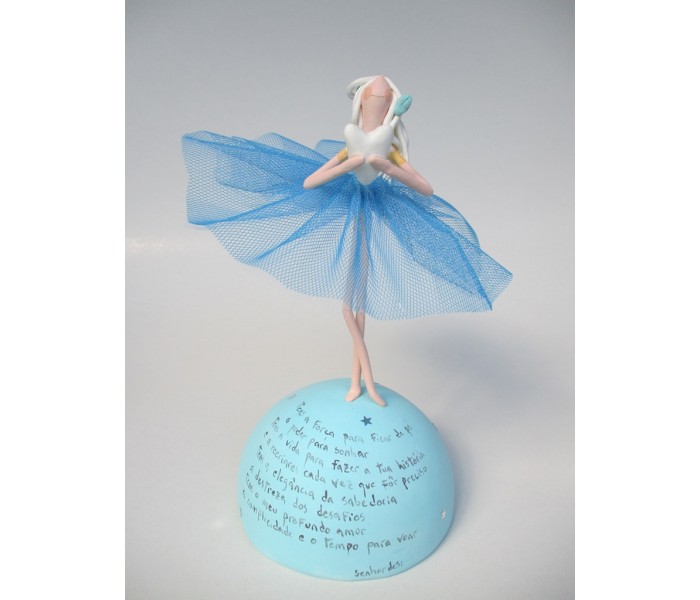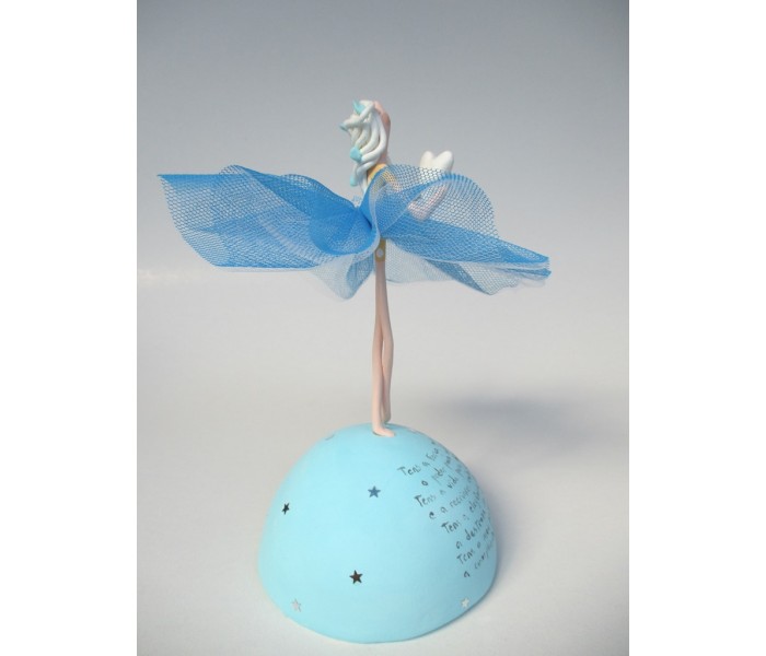 Escultura feita em massa ultra leve com base meio mundo de 10cm de diâmetro, figura de 13cm com texto