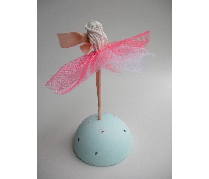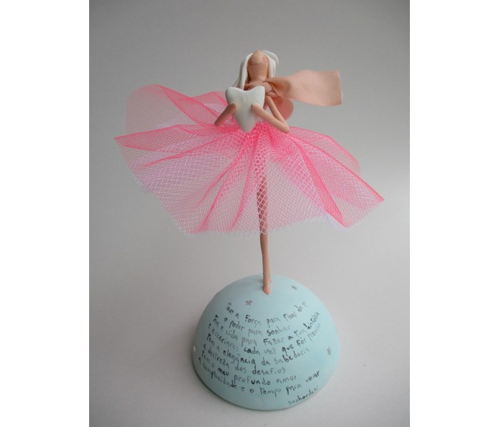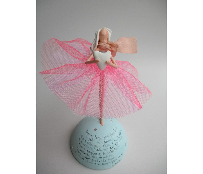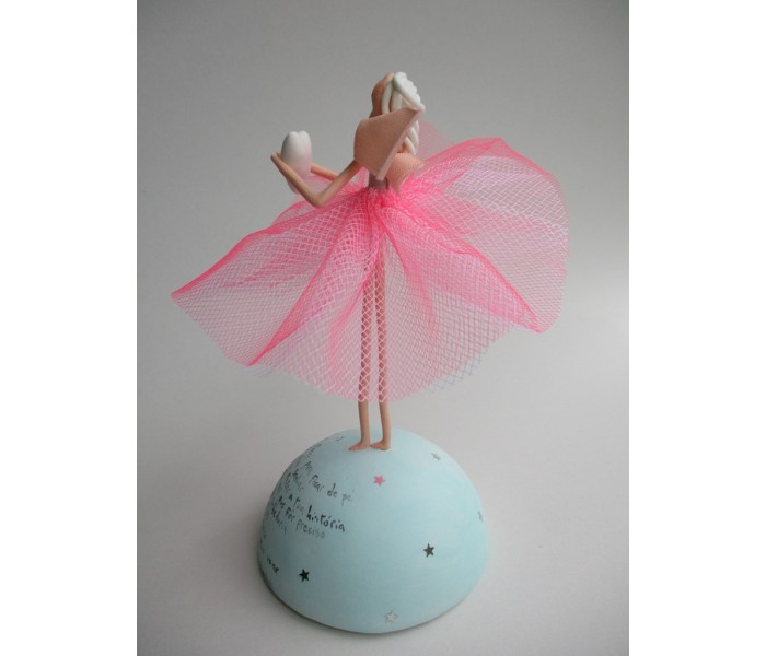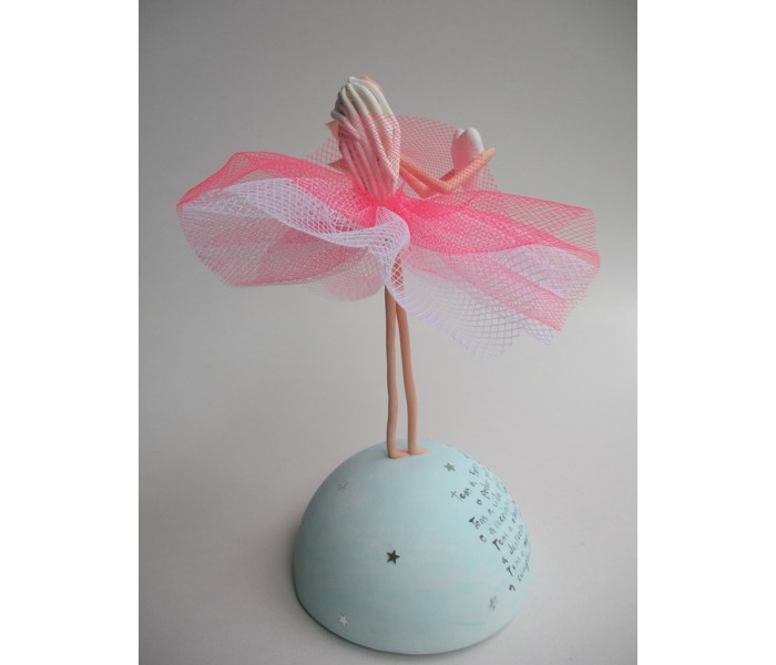 Escultura feita em massa ultra leve com base meio mundo de 10cm de diâmetro, figura de 13cm com texto