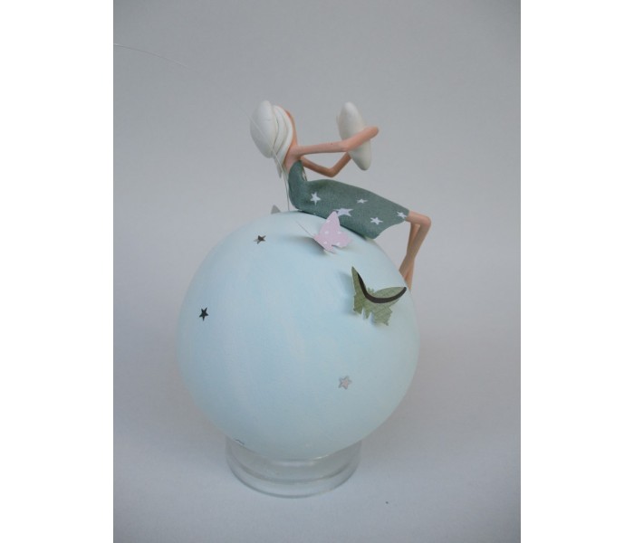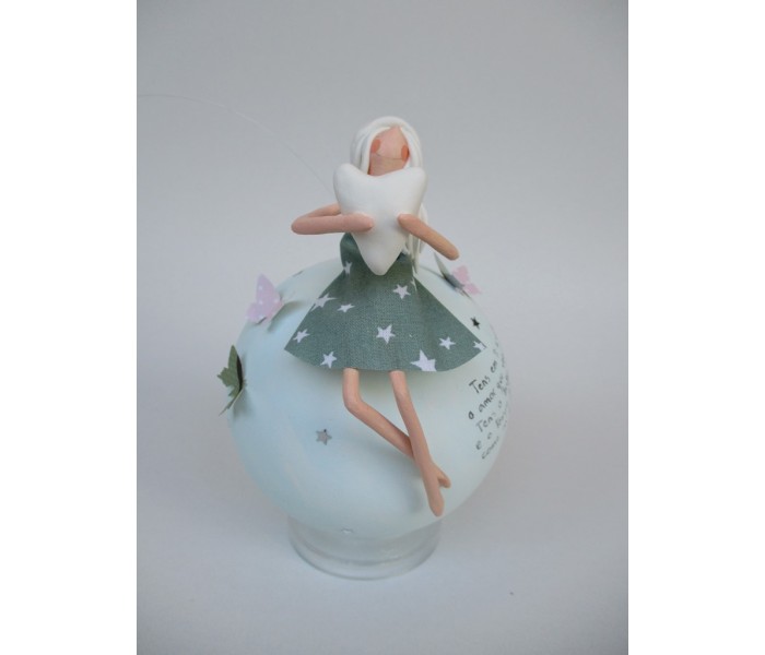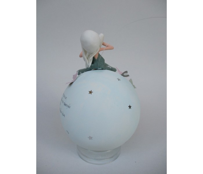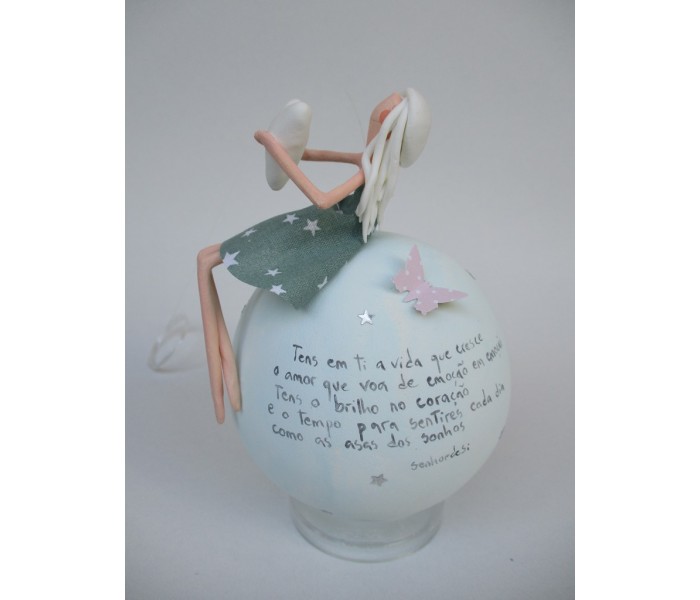 Escultura composta por mundo de 10 cm de diâmetro, figura com 13 cm e texto