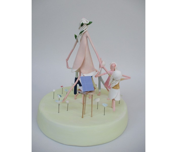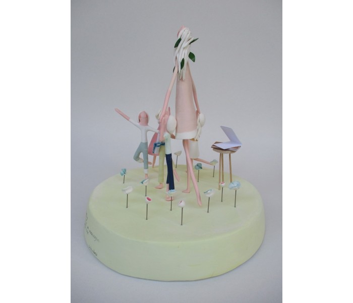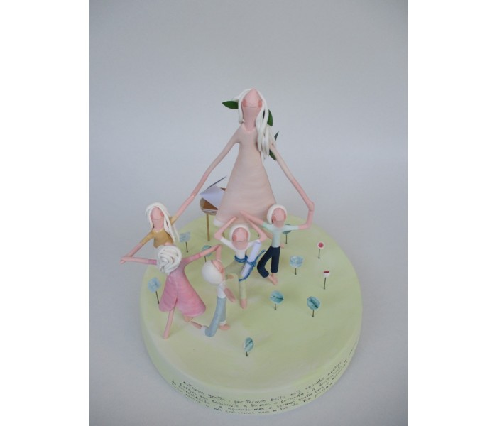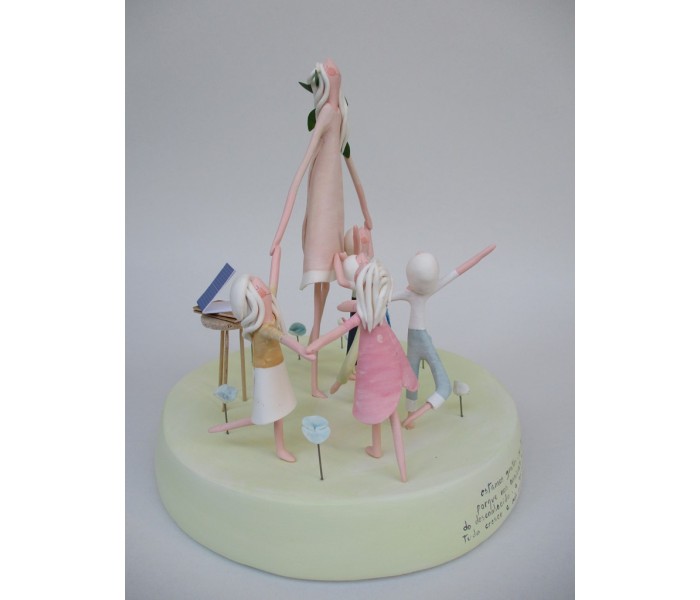 escultura feita em massa ultra leve composta por base com 18cm x 3cm de altura, figura maior de 18cm e 5 mais pequenas, com numero de flores ou corações igual ao numero de alunos e livro com todos os nomes dos meninos